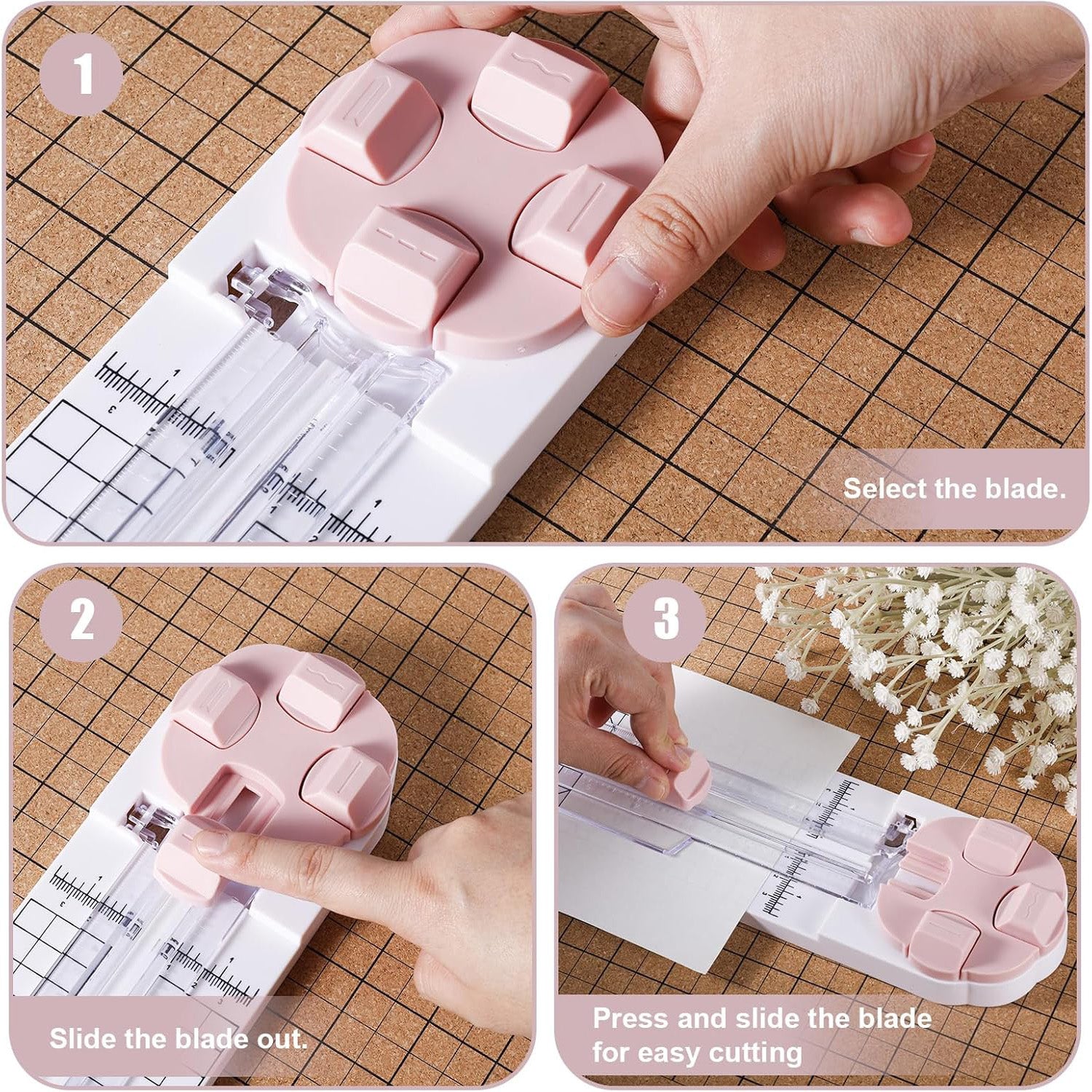 The cutter is simple to operate. Simply rotate the blade to choose the desired cutting shape, press, and slide to make your cut. It’s perfect for everyday DIY crafts, home, office, or school use.