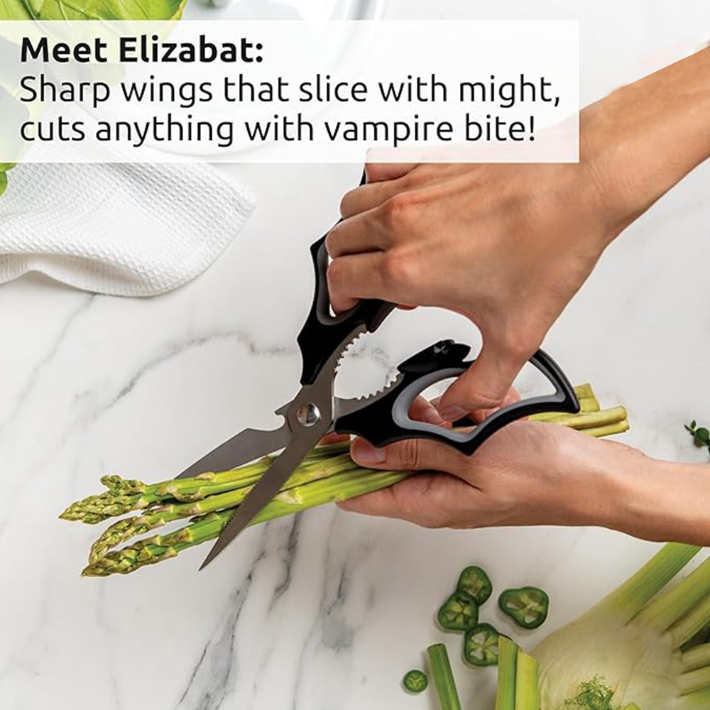 Multi-purpose kitchen shears shaped like a bat, designed for cutting herbs, opening packages, and various kitchen tasks with a comfortable grip.