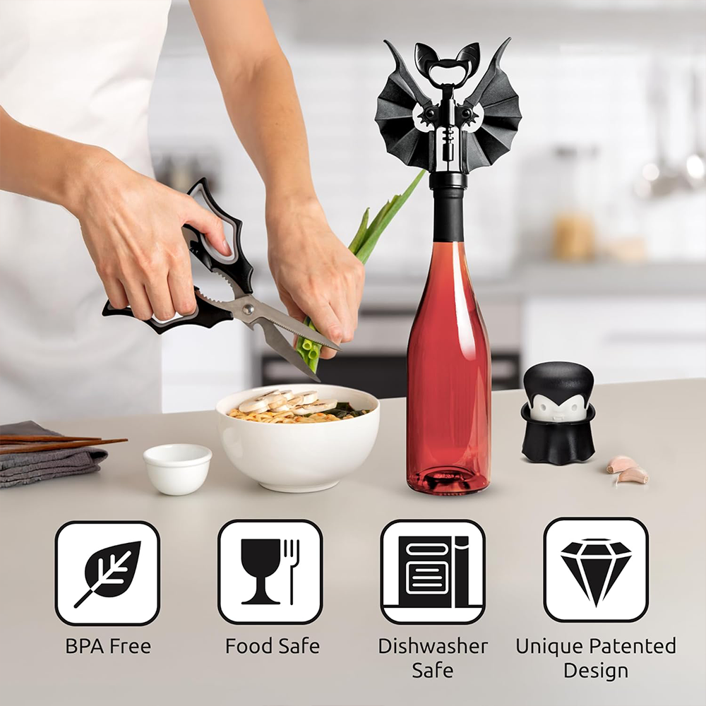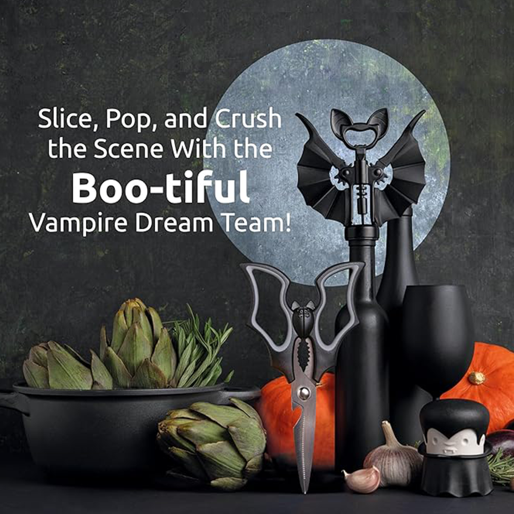 • Set Includes: Bat Shears, Witch Bottle Opener, Stainless Steel Garlic Press