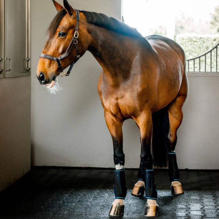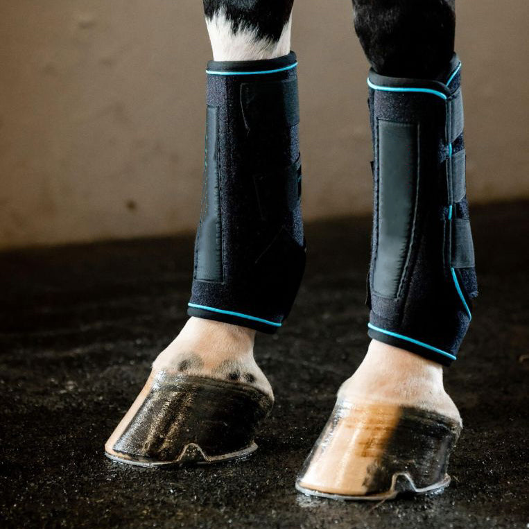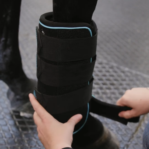 Ergonomic, portable massage boots for horses — used alone or with cold packs for post-exercise recovery, supporting tendon and ligament health in both front and hind legs.