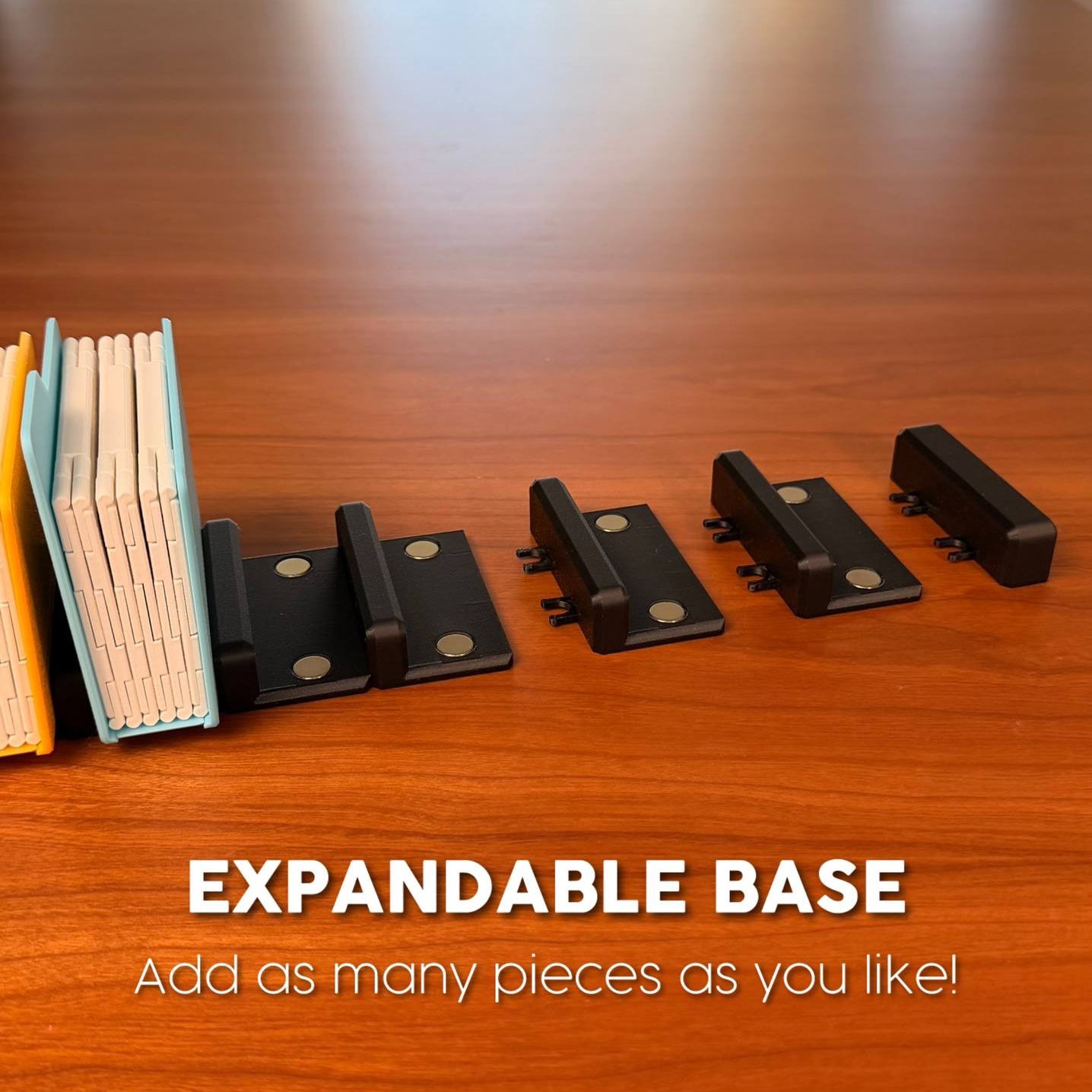 Strong side magnets (10×2 mm) attach to a customizable, expandable base — add more base components as your collection grows.